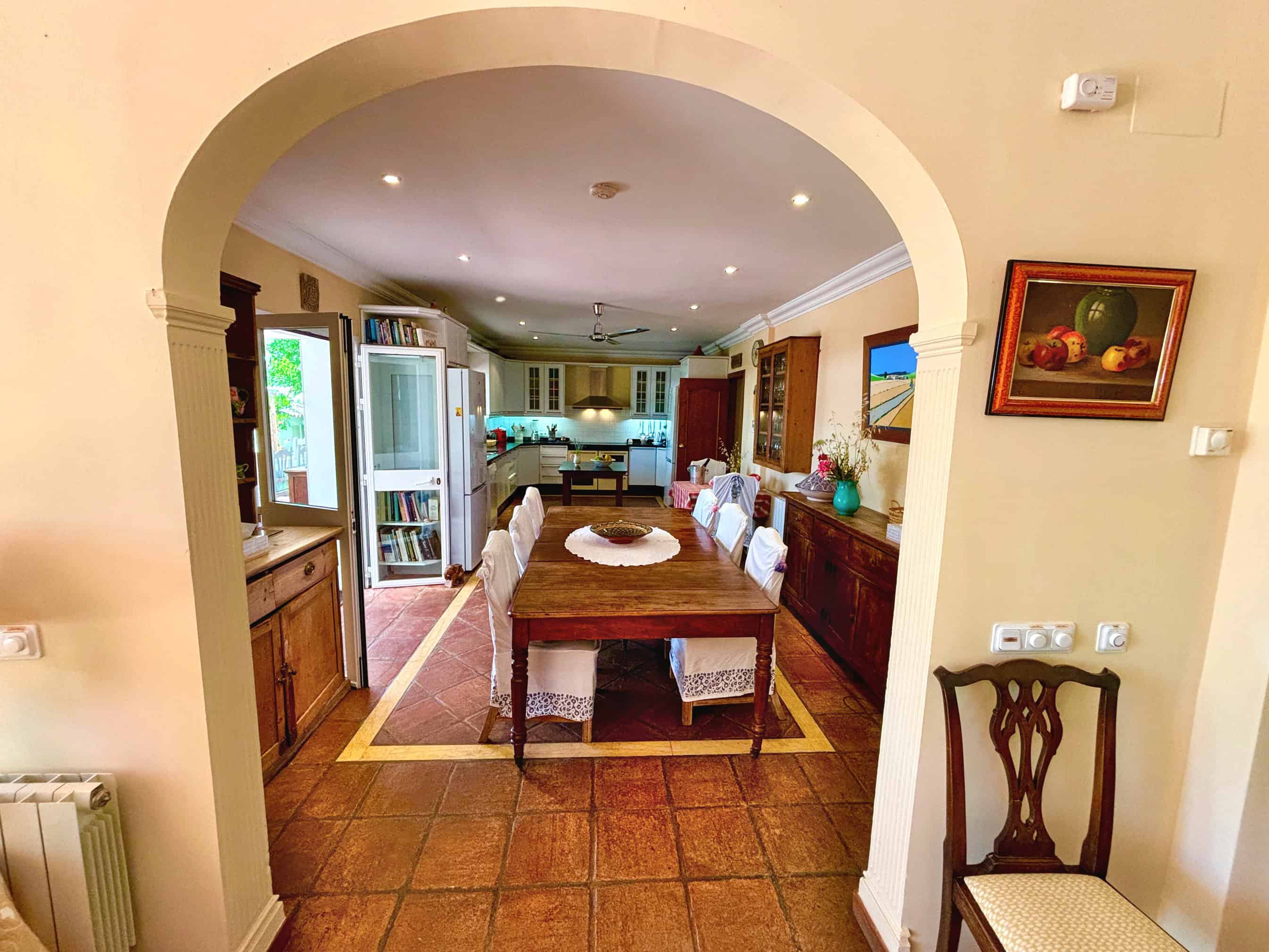 The sleeping accommodation comprises of the master bedroom of 15 x 6m with a super kingsize bed plus a very large and beautiful en-suite bathroom plus four other double bedrooms, three of which have en-suite shower rooms/bathroom. All first floor bedrooms have French doors opening on to a large dining terrace offering wonderful views of the large and immaculately kept gardens and and mountains to one side and softly undulating countryside. Bedrooms four is a children’s room upstairs with twin beds while downstairs bedroom five is a large twin /super king size bedded room with French doors leading to the pool terrace.